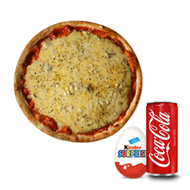 1 Pizza margherita + 1 Ingrédient au choix + 1 Kinder + 1 Boisson 33cl au choix.
