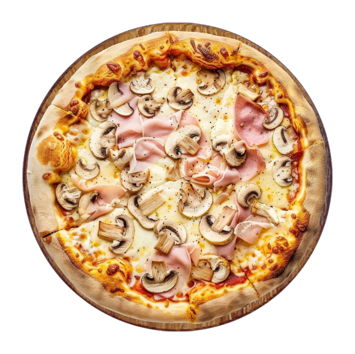 Sauce tomate, fromage, jambon, champignons.