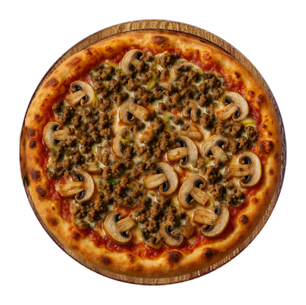 Sauce tomate, fromage, viande hachée, champignons.