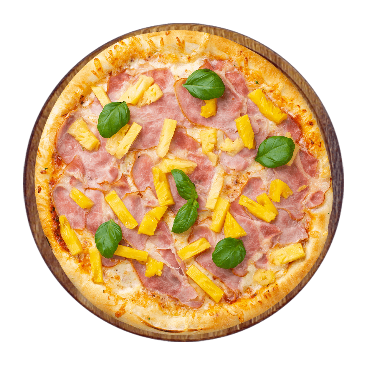 Sauce tomate, fromage, jambon, olives, champignons, artichauts.