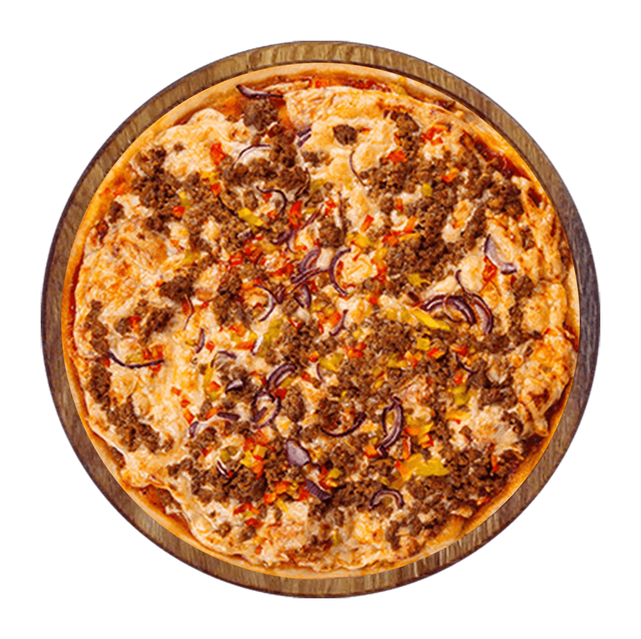 Sauce tomate, fromage, viande hachée, poivrons, oignons, oeuf.